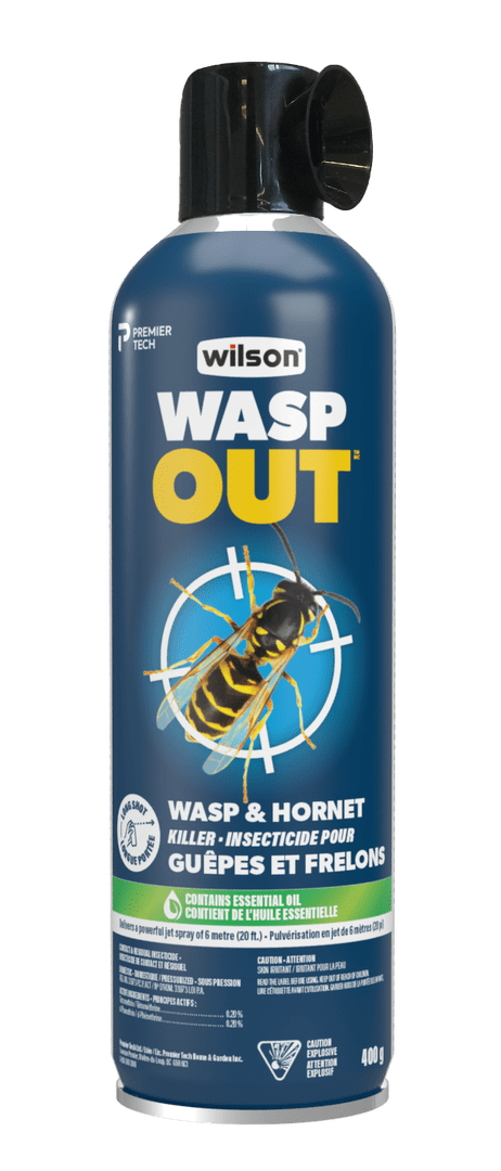 COMMENT UTILISER Enlever le capuchon protecteur et diriger le jet sur le nid ou directement sur l’insecte. Vaporiser et imbiber le nid d’une distance de 2 à 2,5 m. Allouer suffisamment de temps pour que les insectes meurent. OÙ UTILISER À l'extérieur seulement EFFICACE CONTRE Tous les types d’abeilles, de guêpes, incluant les guêpes jaunes et de frelons. CONSEILS Utiliser l’insecticide tard le soir ou tôt le matin lorsque les insectes sont endormis. MÉTHODE D'ÉLIMINATION Lorsque le contenant est vide, presser sur le bouton pour éliminer le gaz sous pression, puis envelopper et jeter avec les ordures ménagères. Ne pas percer ni jeter au feu. ENTREPOSAGE Entre 5 ° C et 35° C PRÉCAUTIONS Nocif si avalé, inhalé ou absorbé par la peau. S’assurer d’une bonne ventilation des lieux lors de l’application. Éviter tout contact avec la peau, les yeux et les vêtements. Éviter d’inhaler le brouillard. Lire attentivement l'étiquette du produit avant son utilisation.