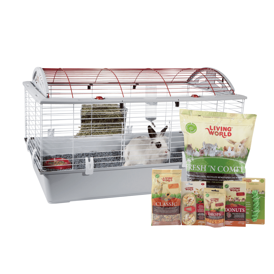 La Cage équipée de luxe Living World pour lapin comprend tout ce qu’il faut pour élever votre petit animal : cage, pare-foin, bol à nourriture, sac de litière Fresh'N Comfy, aliment Classic pour lapins, régals savoureux, bouteille à eau et jouet amusant à gruger. Assemblage facile; aucun outil requis.