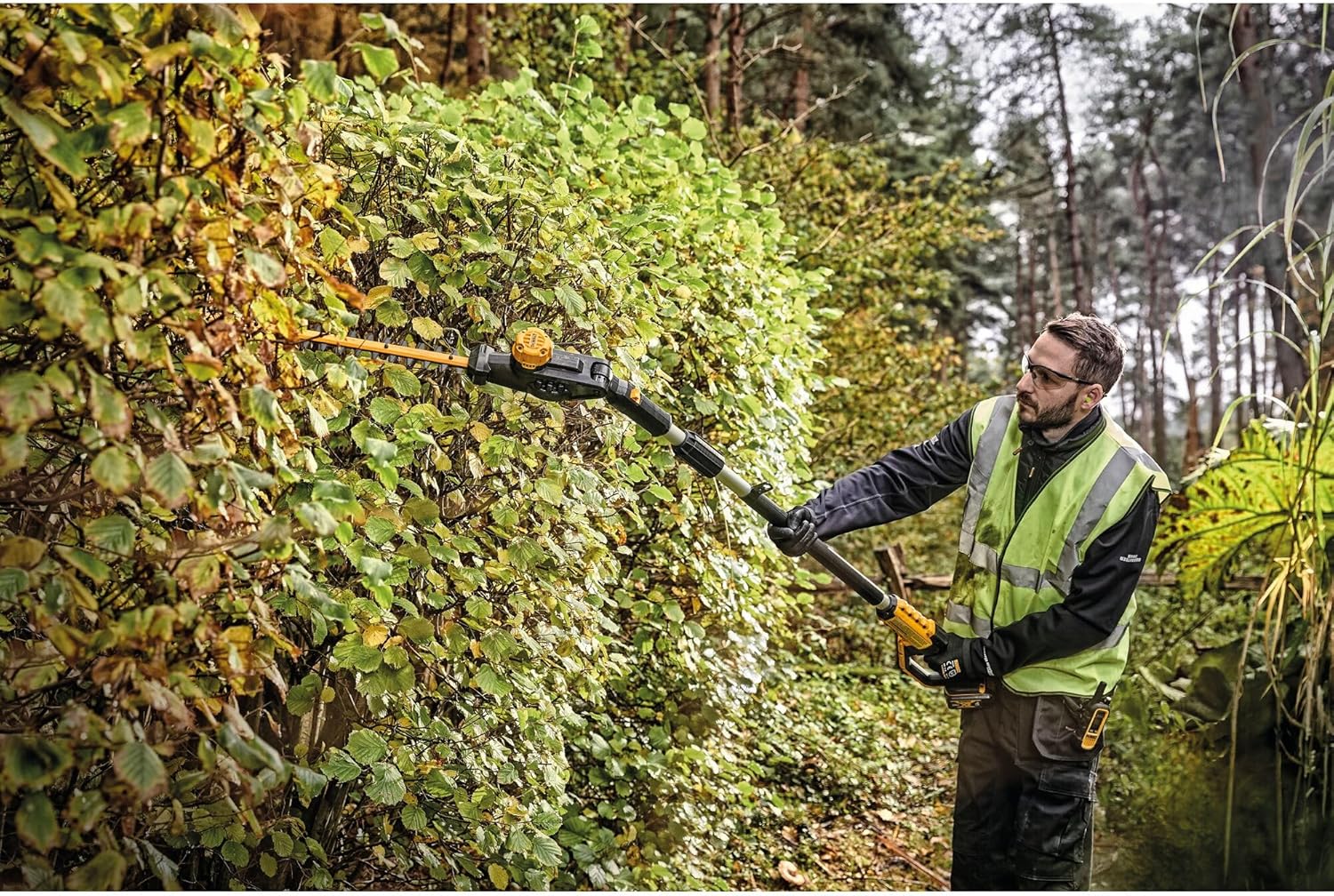Le taille-haie DeWALT 20 Volt Max à pôles est spécialement conçu pour couper une grande variété de surfoissances de paysage. La tondeuse est dotée d'un moteur à haut rendement et d'une lame découpée au laser en acier trempé de 22 pouces conçue pour des coupes propres et supérieures sur des branches jusqu'à 1 pouce d'épaisseur. Cette lame découpée au laser à double action assure une coupe rapide avec 2800 SPM. Il a une tête articulée de 7 positions et de 180 degrés, ce qui permet à l'utilisateur de personnaliser les angles de coupe pour les haies de toute forme et taille. Le taille-haie à poteau peut être étendu jusqu'à une portée maximale de 12 pieds, lorsqu'il est complètement étendu. Il a un écart de coupe de 1 pouce pour des performances de coupe sur des branches épaisses. La tondeuse est livrée avec une batterie DCB204, un chargeur, une tête de coupe, une gaine de lame et une bandoulière.