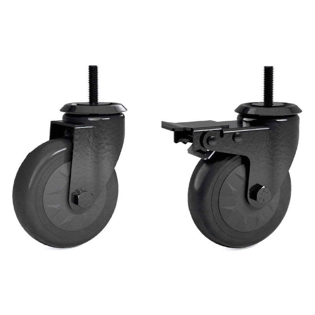 Le kit de blocage pour roulettes (Locking Caster Kit) spécialement conçu pour Big Green Egg se compose de 2 roulettes pivotantes – dont une équipée d’un frein – en coloris noir mat, et peut être monté sur le nid, le système modulaire et la table en acacia.