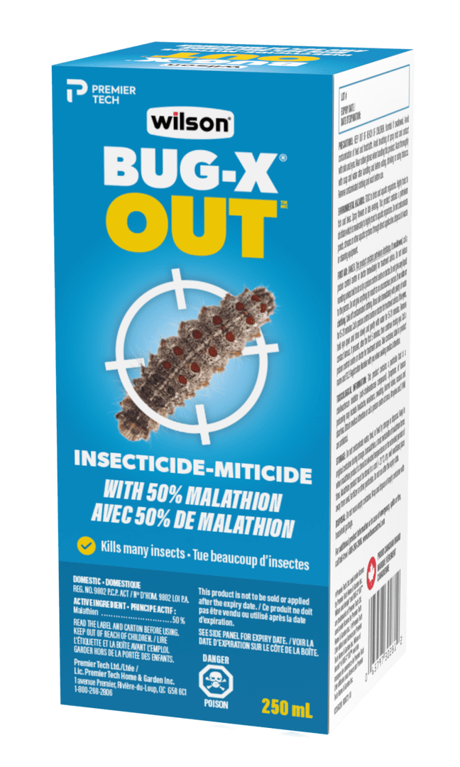COMMENT UTILISER LÉGUMES, FRUITS, FLEURS ET PLANTES ORNEMENTALES : Pour contrôler les aleurodes, bytures des framboises, carpocapse de la pomme, charançons de la prune, chenille burcicole, chenilles, coléoptères, cicadelles, cochenilles, enrouleuses, livrées, mineuses des feuilles, noctuelles des fruits, piérides du chou, pique-boutons, psylles du poirier, pucerons, punaises des plantes, punaises réticulées, pyrales du groseillier, pyrales du pin, acariens. Mélanger 10 mL (2 cuillerées à thé) dans 3 L d’eau et pulvériser de façon à humecter toutes les surfaces des feuilles. Appliquer dès qu’on aperçoit des insectes. Répéter l’application aussi souvent que nécessaire ou une fois par semaine. Ne pas l’appliquer moins de sept jours avant la cueillette des récoltes comestibles. Pour la laitue frisée, prolonger ce temps à 14 jours. Pour enrayer les tordeuses des bourgeons de l’épinette, appliquer à raison de 20 mL (4 cuillerées à thé) dans 3 L d’eau dès qu’on remarque la présence de larves. Ce produit pourrait endommager les violettes africaines, crassules, fougères, pétunias, variétés de genévriers Sabina et Canaerti, érables rouges, pommes McIntosh et Cortland, poires Bosc et Bartlett et raisins Ribier. TÉTRANYQUES DU TRÈFLE, FOURMIS ET MILLIPÈDES : POUR LE TRAITEMENT DES FONDATIONS À L'EXTÉRIEUR UNIQUEMENT et une bande d'un mètre de large autour des fondations. Mélanger 60 mL (4 cuillerées à soupe) dans 1 litre d’eau et pulvériser sur les murs extérieurs des bâtiments. MOUSTIQUES : Mélanger 20 mL (4 cuillerées à thé) dans 3 L d’eau et pulvériser sur 40 m2 d’arbrisseaux. Éviter d'appliquer ce produit quand le vent souffle en rafales. NE PAS appliquer sur un plan d'eau ou un cours d'eau. NE PAS contaminer les approvisionnements en eau d'irrigation et en eau potable ainsi que les habitats aquatiques pendants le nettoyage du matériel ou l'élimination des déchets. OÙ UTILISER À l'extérieur seulement. EFFICACE CONTRE Moustiques, fourmis, aleurodes, bytures des framboises, carpocapse de la pomme, charançons de la prune, chenille burcicole, chenilles, coléoptères, cicadelles, cochenilles, enrouleuses, livrées, mineuses des feuilles, noctuelles des fruits, piérides du chou, pique-boutons, psylles du poirier, pucerons, punaises des plantes, punaises réticulées, pyrales du groseillier, pyrales du pin, acariens, tétranyques du trèfle et millipèdes. CONSEILS Ne pas pulvériser dans l’air ambiant, et ne pas faire de traitement généralisé. MÉTHODE D'ÉLIMINATION Ne pas réutiliser le contenant vide. Envelopper et jeter le contenant vide avec les ordures ménagères. Pour de plus amples renseignements ou en cas d'urgence, de déversement ou d'incendie, composer sans frais le 1 800 268-2806. ENTREPOSAGE Entre 5 ° C et 23° C PRÉCAUTIONS Ne pas contaminer l’eau, les aliments destinés à la consommation humaine ou animale pendant l’entreposage ou l’élimination du produit. Conserver le produit dans son contenant original pendant l’entreposage. L’isomalathion, un métabolite toxique du malathion, se forme lorsque le produit contenant du malathion est entreposé à une température élevée ou pendant une longue période. Le produit contenant du malathion doit être entreposé dans un endroit frais (< 20 à 23 °C), sec et bien aéré, à l’écart des semences, des engrais ou d’autres pesticides. Ne pas utiliser après la date d'expiration.