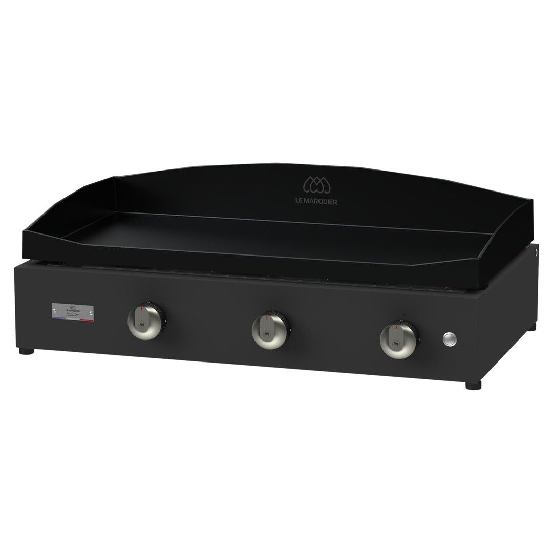 Élégante avec son châssis en acier à finition peinture époxy noir et sa plaque en fonte émaillée inclinable de même couleur, la planche Amalia 375 de Le Marquier est d’une grande facilité d’utilisation au quotidien comme occasionnellement. Elle est équipée de 3 brûleurs inox droit double paroi à haut rendement pour une cuisson optimisée des aliments. Très pratiques, les 3 boutons de commandes ergonomiques disposent d’un allumage piezzo électronique intégré. La plancha est par ailleurs dotée de pieds réglables, d’un récupérateur de graisse carré en inox, et d’un couvercle de protection.