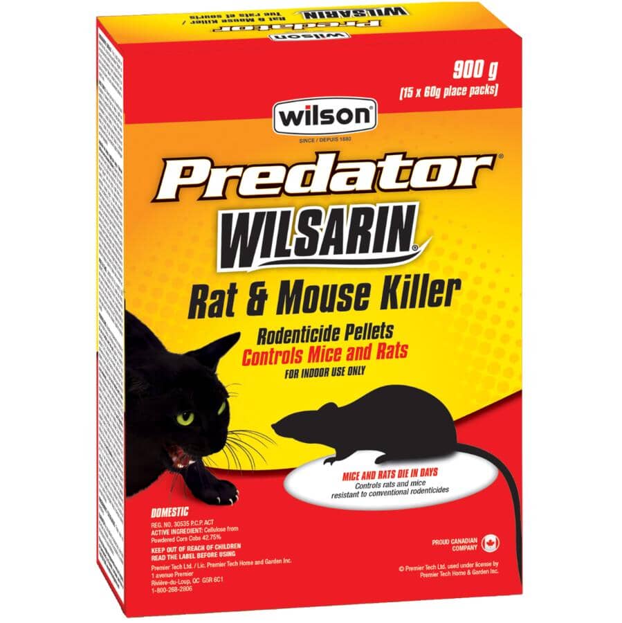 COMMENT UTILISER Enlever toute source de nourriture avant d’appliquer le traitement. Garder une distance de 1,2 à 1,8 m entre les pièges à appât. Garder toujours une quantité d’appât frais pendant au moins 6 à 8 jours pour les souris et au moins 8 jours pour les rats ou jusqu’à ce que cesse tout signe d’activité de souris ou rats pendant une période de 2 jours ou plus. Vérifier les appâts toutes les 48 heures. OÙ UTILISER À l'intérieur : aux endroits où il y a signes d’activité de souris ou rats comme des déjections fraîches ou à proximité de terriers, enclos, postes d’alimentation et points d’entrée. EFFICACE CONTRE Rats et souris CONSEILS Le meilleur temps pour appliquer le produit : pendant les périodes où la nourriture est limitée et l’activité est plus élevée. Garder le contenant hermétiquement fermé pour empêcher l’appât de développer une odeur désagréable. MÉTHODE D'ÉLIMINATION Ne pas réutiliser le contenant vide. Jeter dans les ordures ménagères. La boîte est recyclable là où existent des programmes ou des installations. PRÉCAUTIONS Garder ce produit hors de la portée des enfants, des animaux domestiques et de la faune. Il est recommandé de porter des gants protecteurs pour se débarrasser des souris et des rats morts ou manipuler les pièges à appât qui ont été visités par les souris et les rats. Toujours se laver les mains après avoir touché les carcasses, l’appât et les pièges à appât.
