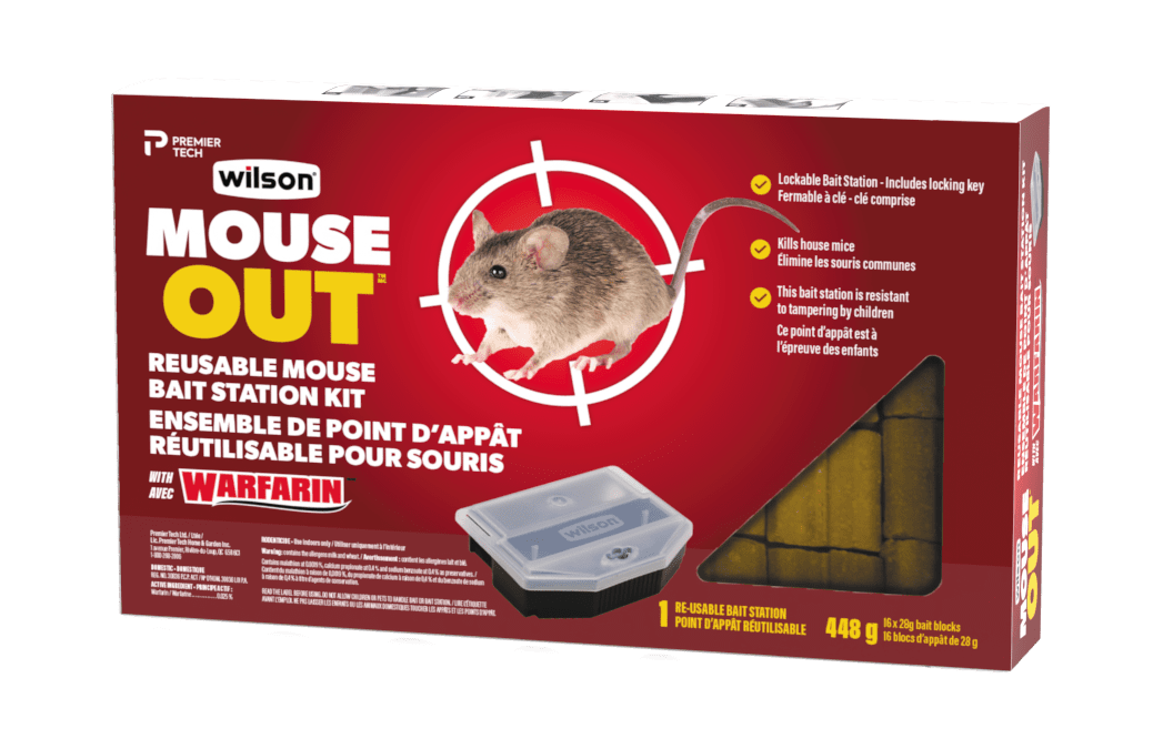 COMMENT UTILISER Insérer le plus petit bout de la clé noire de plastique dans le trou de la serrure ou dans l’ouverture du point d'appât située dans le couvercle transparent. Si bien insérée dans le point d'appât, la clé restera à la verticale par elle-même. Tourner la clef d’un quart de tour, peu importe le sens, jusqu’à ce qu’elle soit bien serrée. À ce moment-là, soulever doucement la clef pour ouvrir le point d'appât. Retirer la clé. Placer le point d’appât dans le compartiment carré. Fermer le couvercle jusqu'à ce qu’il s’enclenche; s’assurer que le point d’appât est fermé à clé. OÙ UTILISER Placer les points d’appât dans les endroits fréquentés par les souris, tels que près des trous ou des pistes, contre les murs ou dans les coins où se trouvent les souris. EFFICACE CONTRE Rats et souris CONSEILS Un récipient peu profond d’eau potable encourage la consommation de l’appât. Placer les points d’appât à des intervalles de 2 à 5 mètres. Utiliser l'intervalle le plus petit dans les endroits de haute activité des souris communes. Maintenir un approvisionnement constant d’appât pendant au moins 15 jours. MÉTHODE D'ÉLIMINATION Envelopper les points d’appât inutilisés ou endommagés et les jeter avec les ordures ménagères. Ne pas utiliser les points d’appât endommagés. Jeter les rongeurs morts aux ordures ménagères ou les enterrer. La boîte vide est recyclable. ENTREPOSAGE Conserver dans un endroit frais et sec, à l’écart des aliments destinés à la consommation humaine ou animale et des autres produits chimiques. Ranger la portion inutilisée du produit dans son contenant d’origine, dans un endroit sûr à l’abri des enfants et des animaux non ciblés. Entre 5 ° C et 35° C. PRÉCAUTIONS Ce produit contient un anticoagulant chimique et, en cas d'ingestion accidentelle par des êtres humains, des animaux domestiques, familiers ou sauvages, cette substance peut réduire la capacité de coagulation du sang et causer des saignements. Lire attentivement l'étiquette du produit avant son utilisation.