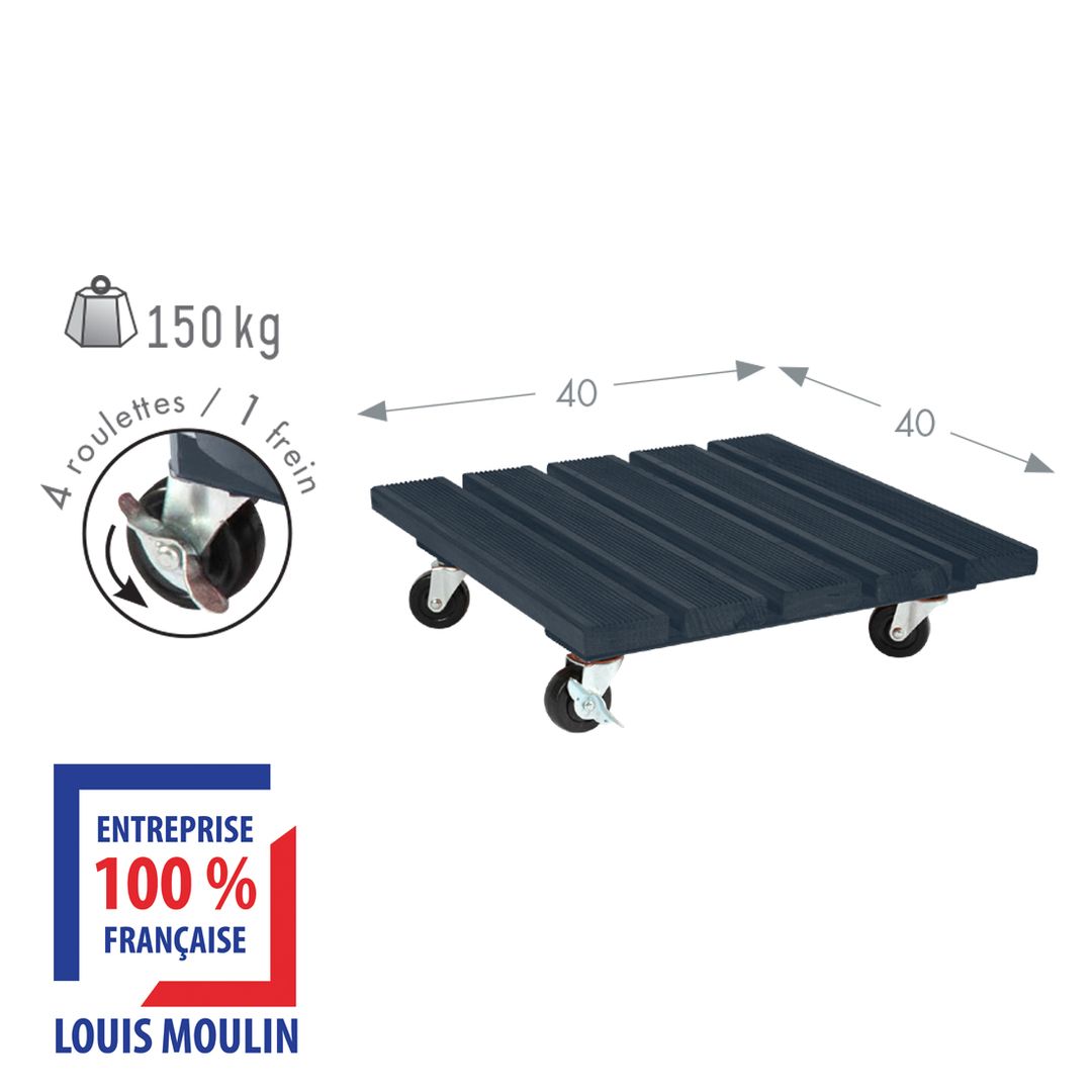 Ce roule plante en bois teinté anthracite carré de 40x40 cm dispose de 4 roulettes dont 1 frein, il vous permettra de déplacer facilement vos pots, il supporte un poids maximal de 150 kg. Conçu pour l’intérieur et l'extérieur, il s’adapte à toutes les décorations et sait rester discret. Veillez à répartir le poids uniformément sur le roule plante.