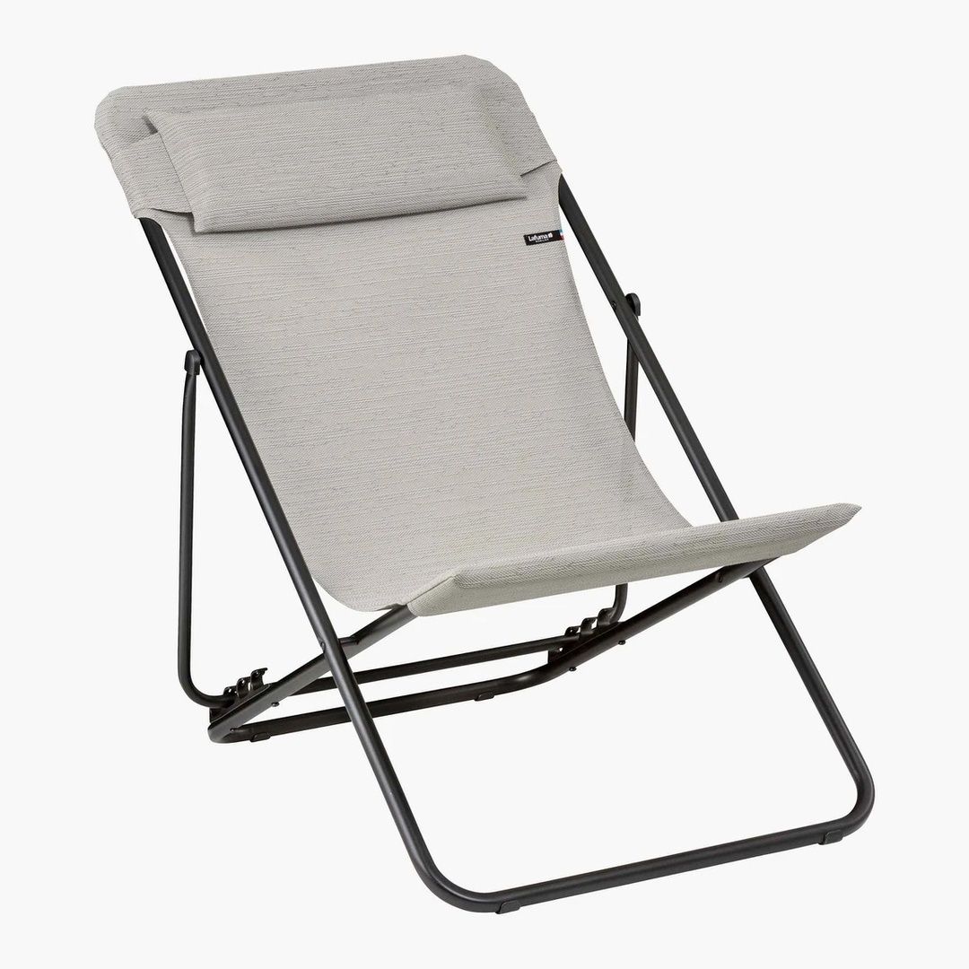 Ce Maxi Transat Plus vous séduira avec son châssis grande largeur. Son absence de traverse au-devant de l'assise offrira à vos jambes un confort exceptionnel. Sa toile Batyline® Duo amovible vous permettra d'entretenir votre chaise longue rapidement et facilement. Avec ses crémaillères de sécurité 4 positions vous pourrez ajuster l'inclinaison du dossier pour obtenir votre confort idéal. Ce produit ira aussi bien à l'intérieur qu'à l'extérieur grâce à ses 4 patins de protection. Ses atouts :- Ses dimensions généreuses, qui lui permettent de jouer dans la cour des grands avec ses 65 mm de largeur. Un format beaucoup plus confortable et accueillant qu’un transat standard.- Son pliage ultra-compact, qui le rende facile à déplacer et à ranger.- Sa toile Batyline® Duo, qui affiche une belle résistance aux UV, à l’abrasion et aux déchirures. Spécialement pensée pour le mobilier outdoor, elle est traitée anti-moisissures et sèche rapidement. Elle joue aussi la carte du développement durable avec son label Oeko-Tex® (sans produits toxiques pour le corps et pour l'environnement).- Son absence de traverse sur le devant de l'assise, qui lui assure un meilleur confort.- Ses quatre positions, qui sont verrouillables par crémaillères de sécurité.- Sa têtière en mousse amovible. Ses caractéristiques :Structure tube acier HLE (Haute Limite Élastique) de 22 mm de diamètre 140 KG MAX / 4 POSITIONS / ANTI-UV